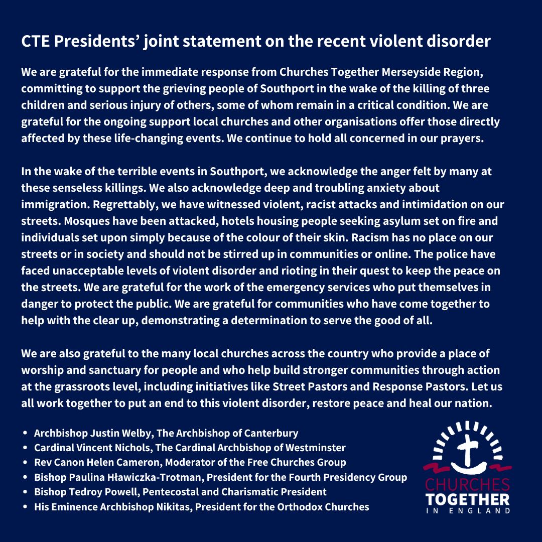 - Das Präsidium des Kirchenbündnisses Churches Together in England CTE, in dem die Brüdergemeinne als eine von 54 Kirchen mitarbeitet, hat am 6. August 2024 eine gemeinsame Erklärung abgegeben, mit der auf die jüngsten gewalttätigen Unruhen im ganzen Lande reagiert werden soll. Das Bündnis fordert Kirchen und Gemeinden auf zusammenzuarbeiten, damit der von den Krawallen in Sunderland ausgehenden Gewalt ein Ende gesetzt, Frieden wiederhergestellt und das Land geheilt wird. Zum vollständigen Text hier.