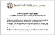 | | | Every year on a Sunday around 1 March, the so-called Unity Offering, the purpose of which is determined by the bodies of the worldwide Moravian Church, is requested for in all Unity and mission provinces worldwide in memory of the founding of the Old Moravian Church in the spring of 1457 in Kunvald, Bohemia. In 2024, the Unity Offering is intended for the work of the Moravian Church in Germany and the Czech Republic with refugees from Ukraine. To the collection announcement in English here. |